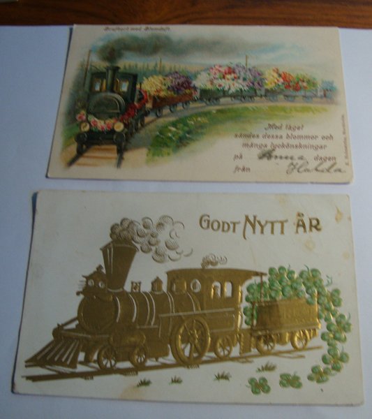 Två vykort med motiv av tåg. Ena har Brefkort med blomdoft. Frankerat och skrivet. Bruksnötta doften har försvunnit.