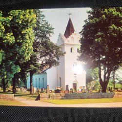 Vykort med motiv av Luleå. Färgfotografi som visar en kyrka med hög spira och omgivande byggnader samt vatten i bakgrunden.