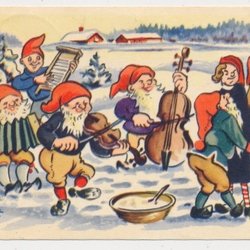 Frank P Julkort Småkort Ett troll smyger på tomtar som dansar runt gran *