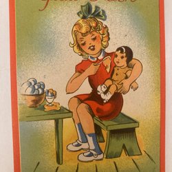Ett sött påskkort med en flicka som håller en docka. På bordet står en skål med ägg.