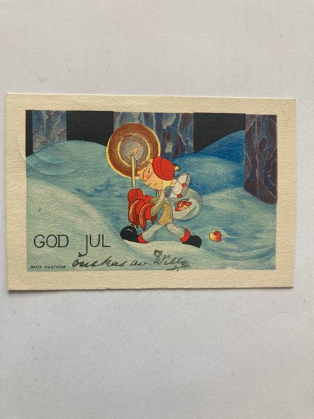 Ett julkort med illustration av Brita Nyström. På kortet står det "God Jul".