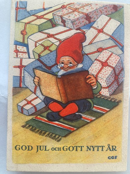 Ett julkort med en illustration av en tomte som läser en bok omgiven av julklappar. På kortet står det "GOD JUL och GOTT NYTT ÅR".