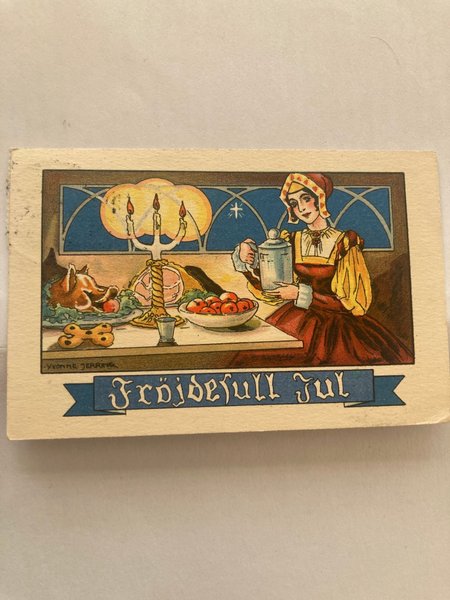 Ett äldre julkort med motiv av en kvinna vid ett bord med julmat. På kortet står det "Fröjdefull Jul".