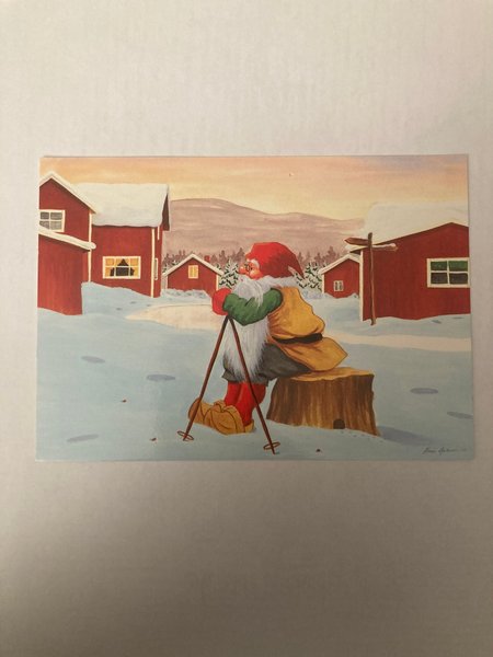 Ett julkort med en illustration av en tomte i ett vinterlandskap med röda stugor.