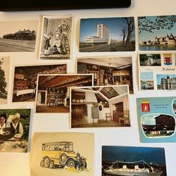 En samling vykort med olika motiv och från olika platser.