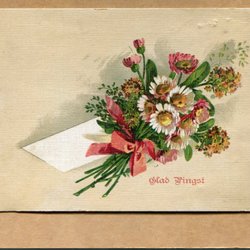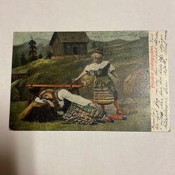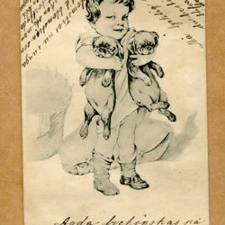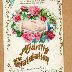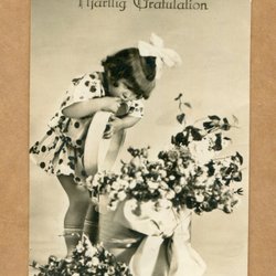 Ett vykort med motiv av ett barn i traditionella kläder som bär en korg med blommor och en kvist. Texten "Hjärtlig Gratulation" är tryckt nedtill. Vykortet är poststämplat och har ett frimärke.