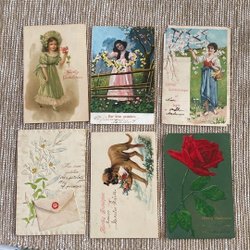 Ett vackert vykort med motiv av ett kärlekspar omgivet av änglar och blommor. Texten på kortet är handskriven. Guld/relief