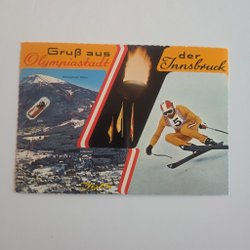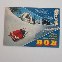 Ett vykort med motiv av en bobsläde i en bana med nationsflaggor i bakgrunden.