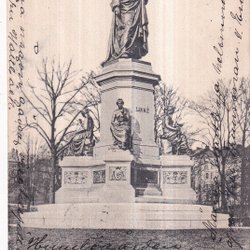 En bild föreställande St Albans Clock Tower. Motivet visar klocktornet med en gatuscen nedanför. På gatan syns människor och byggnader. Bilden har en äldre stil med färgade inslag.