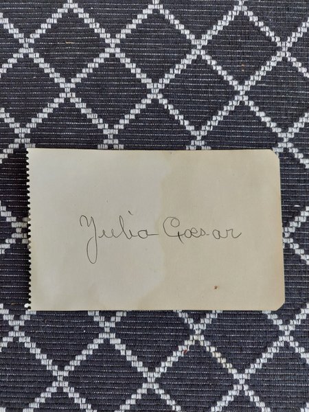 Autograf från skådespelerskan Julia Caesar. Hon var en folkkär skådespelerska och komedienne, verksam under drygt 60 år på 1900-talet.