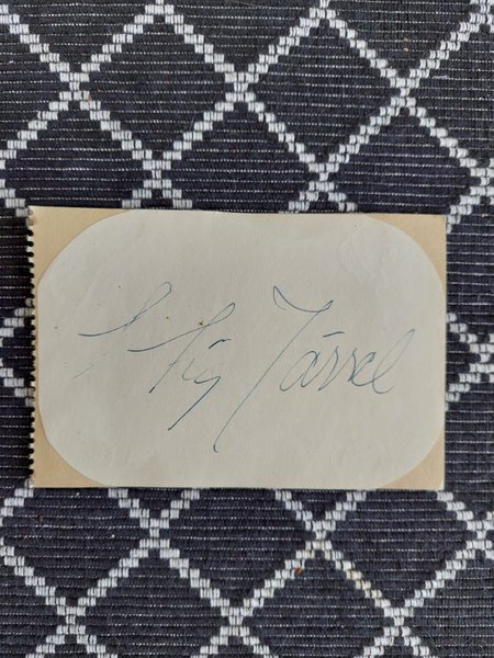 Autograf från skådespelaren Stig Järrel. Järrel var en av 1900-talets mest välkända svenska skådespelare. Han hade ett brett register och behärskade allt från revy till dramatik.