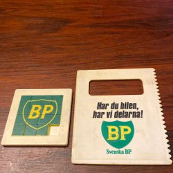 Fyrkantigt askfat i keramik med textur. Askfatet är grönt och brunt med en ”BP”-logotyp i botten. Finns nagg se bilderna.