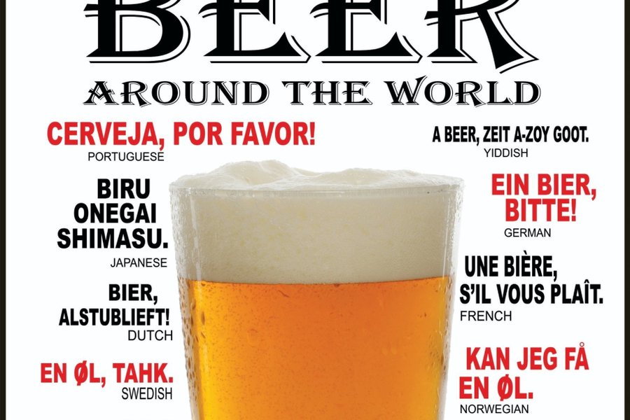 En affisch som visar hur man beställer öl runt om i världen på olika språk. Eco-Solventprint i högsta kvalitet