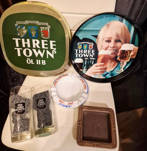 Samling av Three Towns artiklar. Inkluderar bricka, glas, askfat och skylt.
