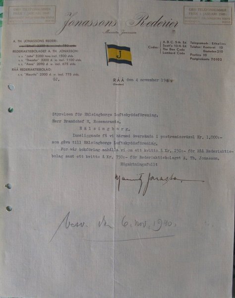 Old freight note from the shipowner Jonassons Rederi in RÅÅ, Helsingborg. November 4, 1940).