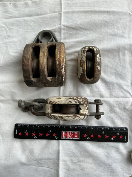 Ett parti med tre äldre träblock och taljor. Två av blocken är i trä med metallfästen, varav ett har dubbla hjul och det andra har ett hjul med en karbinhake. Det tredje blocket är mindre och har ett hjul. Mått finns på bild.