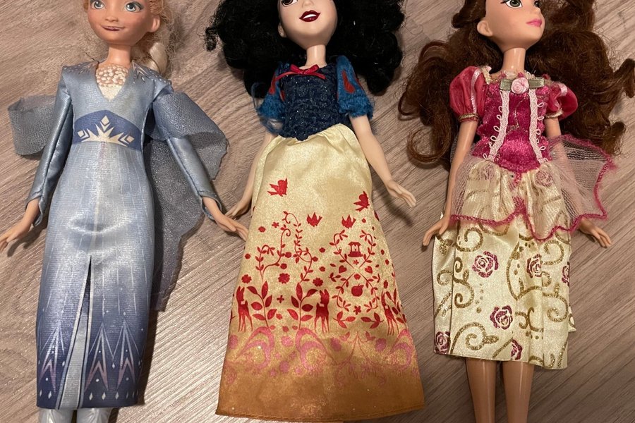 Tre dockor föreställande Disney prinsessor. Inkluderar Elsa, Snövit och en Belle.