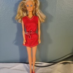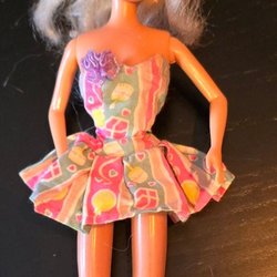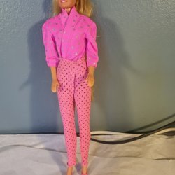 Vintage Barbie docka med blont hår och blå ögon. Hon har en rosa jacka, en vit topp och lila byxor. Tillverkad i Filippinerna