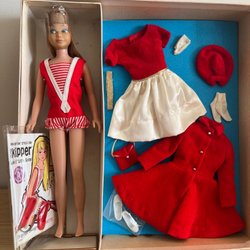 Barbie Pilotdocka med tillbehör från 1999. Dockan är klädd i pilotuniform med hatt och har med sig en resväska.