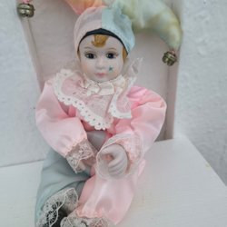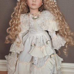 En vacker porslinsdocka med blont hår och en brun klänning med spetsdetaljer. Dockan har en ställning.