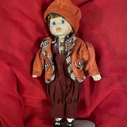 Fin porslinsdocka klädd i en gulddräkt och hatt, sittandes på en kudde. Spelar vackert och rör på sig med vred baktill.