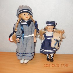Två söta porslinsdockor med blont hår och blårandiga klänningar. Den större dockan är cirka 40 cm lång och den mindre är cirka 30 cm lång. Båda dockorna har vita skor och strumpor.