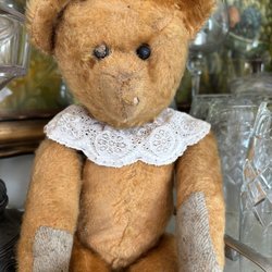 Säljer en liten söt docka från den tyska docktillverkaren Theodor Recknagel. Dockan mäter ca 20 Hon har en mohairperuk i ganska dåligt skick. Jag har inte tagit av henne underkläderna då de är sydda så att det inte går utan att förstöra… Kläderna består av en vit klänning med spetsdetaljer från tiden. En extra klänning med spets medföljer. Har inte provat den på men det ser ut som den passar henne.