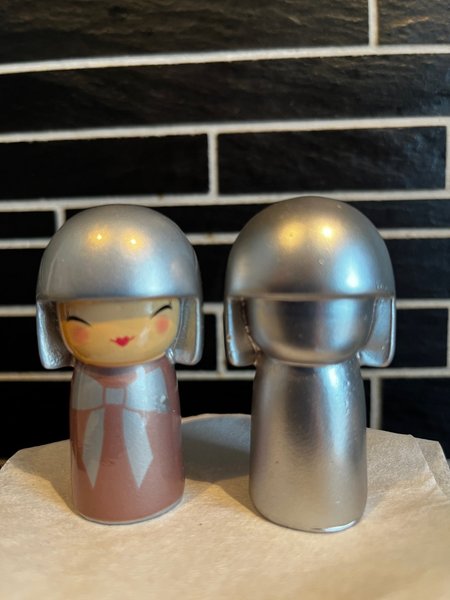 Två kokeshidockor i trä. En docka är målad med ett ansikte och en rosa klänning med en silverfärgad rosett. Den andra dockan är silverfärgad.