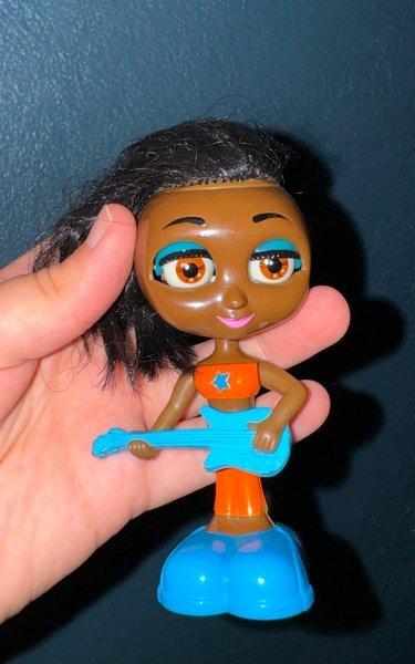 Söt liten docka med långt svart hår och en blå gitarr. Dockan bär en orange topp och blå byxor. Perfekt för leksaks- eller samlarkollektioner.