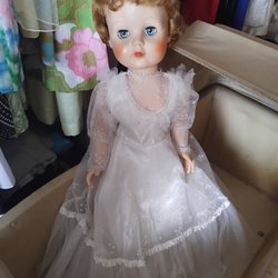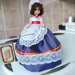 Docka märkt Athena 60/65. Dockan har blont hår, bruna ögon och rosa läppar. Hon bär en stickad tröja i vitt, orange och brunt, samt en gul kjol med blommigt broderi och vita strumpor.