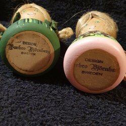 Disse dukker er klædt i matchende grønne fløjlsdragter. Dukken i kjole har brunt hår stylet i to hestehaler med hvide sløjfer. Dukken i buksedragt har en matchende hat. Begge dukker har åbne munde og fregner.