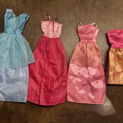 Skipper docka märkt Mattel Inc. med två klänningar och en dräkt. Kläderna har skavanker av slitage, se bilder för skick. Dräkten har en reva på benet, samt defekt vid ärmslutet. Den vita och röda klänningen är trasig i ena armhålan samt fläckig på det vita. Kläderna samt dockan luktar lite instängt då de legat i en låda.