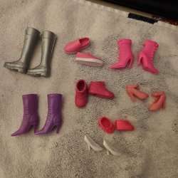 Ett set med Barbie skor i olika färger och modeller.