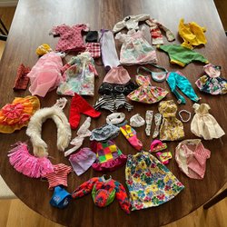 Ken kläder, inkluderar en blå jacka, en rosa jacka, en lila tröja och ett par svarta byxor.