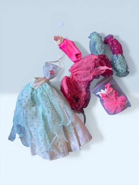 Detta set innehåller en samling Sindy kläder och accessoarer. I paketet finns en ljusblå klänning med glitterdetaljer, en rosa topp, flera tyllkjolar i olika färger som rosa, blå och lila, samt en liten handväska. Dessutom ingår en liten påse med extra accessoarer, inklusive en rosa tyllkjol och vita och rosa skor.
