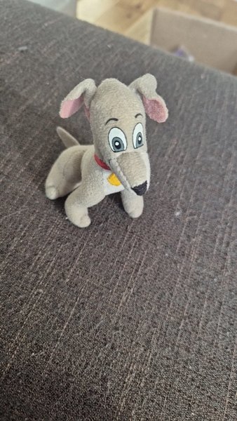 Mjukdjur i form av en hund. Hunden är ljusbrun med rosa insida på öronen och har ett rött halsband med en guldfärgad berlock.