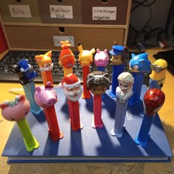 Samling av PEZ-figurer. Inkluderar karaktärer från Disney, Paw Patrol, Hello Kitty och andra.