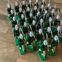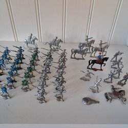 Samling av leksakssoldater tillverkade i metall. Inkluderar soldater till häst, trumslagare, vakter och infanteri. Prince August. 19 figurer. 393 gram. Djur och rökfritt hem. Samfraktar .