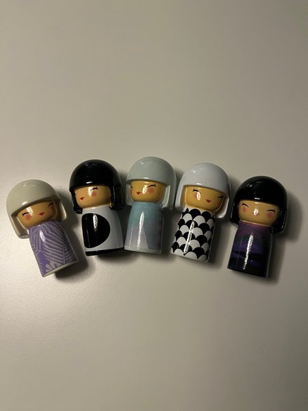 Set med 5 Kokeshi-dockor i olika färger och mönster. De är inspirerade av traditionella japanska Kokeshi-dockor.