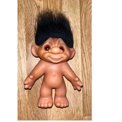 Söt Dam Troll docka från 1986. Denna docka har orange hår, en blommig skjorta och gröna byxor. Märkt med ”DAM 1986” och ”Made in China” på fötterna. Cirka 18 cm hög.