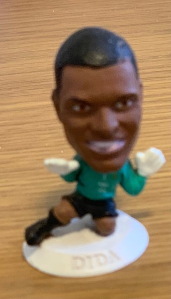Fotbollsfigur föreställande Dida. Figuren är klädd i en grön tröja, svarta shorts och vita handskar. Den står på en vit bas med namnet ”DIDA” ingraverat.