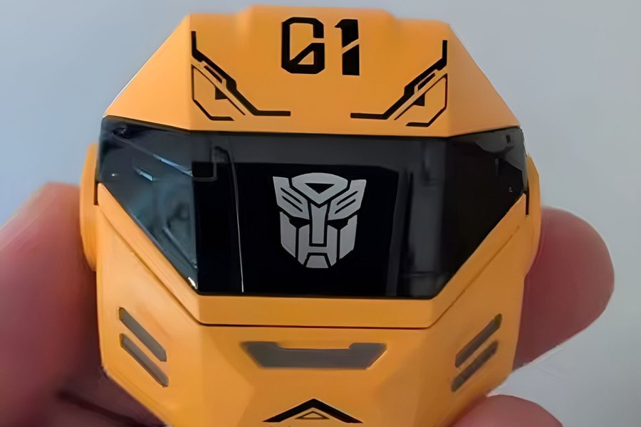 Ett gult hörlursfodral med Transformers Bumblebee design. Fodralet har en Transformers-logga på framsidan och nummer 01 på toppen.