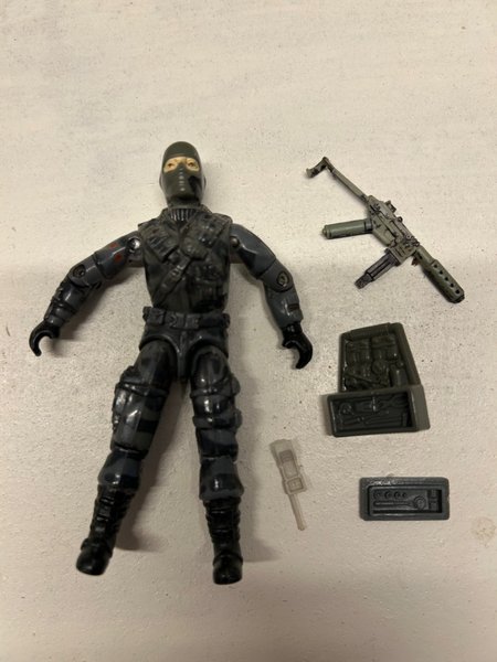 Actionfigur från G.I. Joe. Figuren är klädd i svart och grått med en svart mask. Medföljer gör ett gevär, en grå låda med verktyg och en mindre grå rektangulär del.
