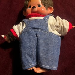 En söt Monchhichi docka med brun päls och blå blöja. Perfekt för samlare eller som en charmig leksak.