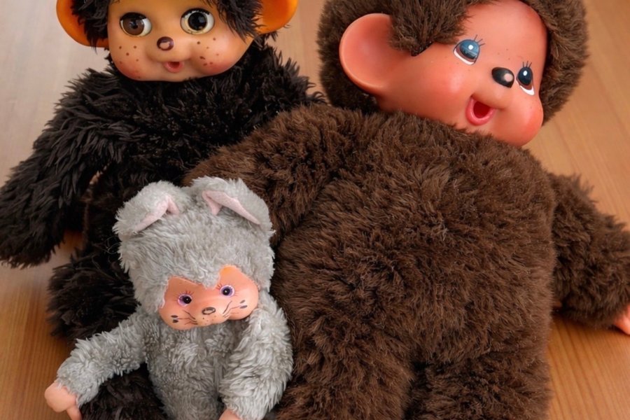 Set med tre Monchichi-dockor. En stor svart Monchichi, en stor brun Monchichi och en liten grå Monchichi.