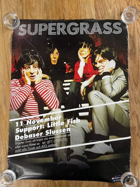 Miss inte chansen att skaffa denna fantastiska konsertposter från Supergrass, som kommer att göra ditt rum rockigt cool! Supergrass var kända för att vara ett av de mest energiska livebanden under 90-talet och deras hitlåtar som "Alright" och "Caught by the Fuzz" är fortfarande klassiker idag. Så varför inte addera lite britpop charm till ditt hem med denna ikoniska poster? Beställ din idag!