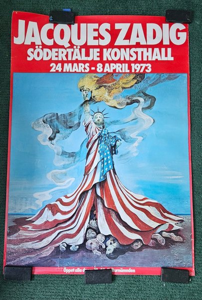 Anti-amerikansk affisch, visar frihetsgudinnan inslagen i en blodig amerikansk flagga. Bärgad från mitt pojkrum (ja uppväxten var bra, tackar som frågar) men enl min fru ingen vägg i huset som nu skulle klara av dess pondus. Varpå den säljes vidare. Då den är typ dubbelt så gammal som jag är så har den lite åldersförändringar speciellt i kanterna, även hål i överkant efter tidigare stift, säkerligen inget som kommer synas om man ramar in.