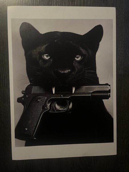 Affisch med motiv av en svart panter som håller en pistol i munnen. Bilden är svartvit.