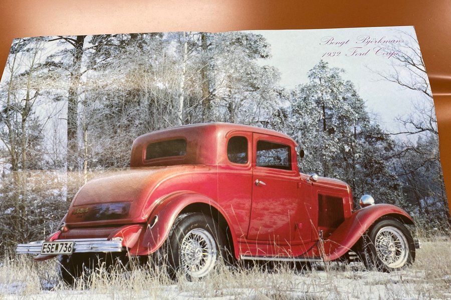 Affisch med en röd bil i vinterlandskap. Bilen är en 1932 Ford Coupe.