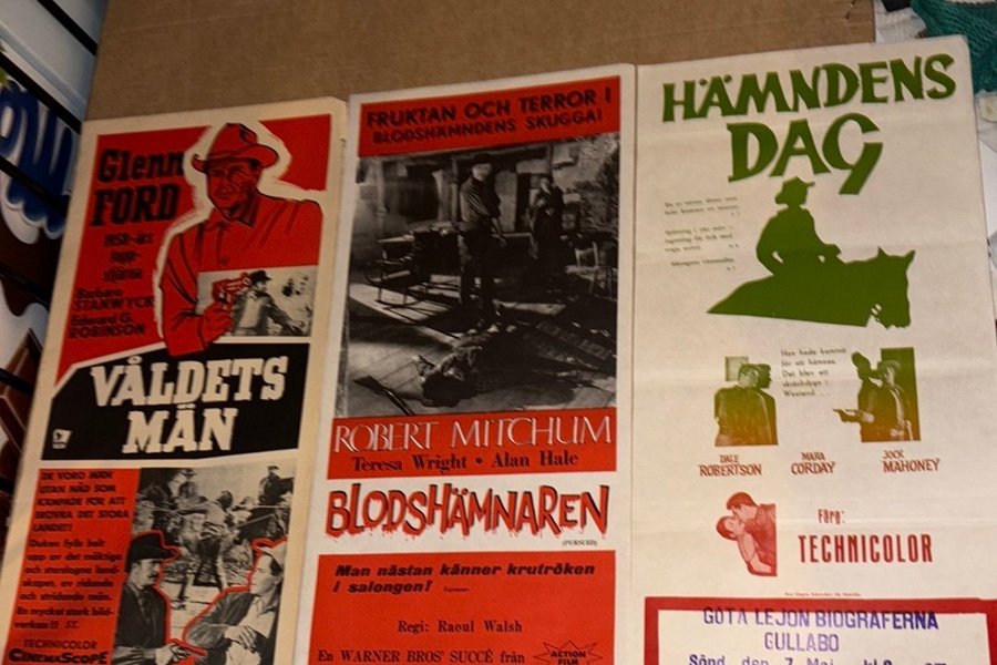 Tre bioaffischer: Våldets män med Glenn Ford, Blodshämnaren med Robert Mitchum och Hämdens dag.